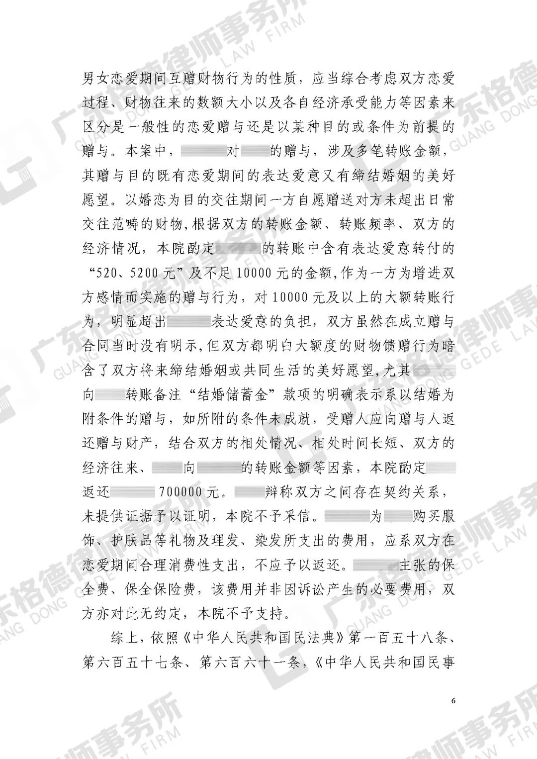 案件结果:法院采纳律师代理意见,认定原告于恋爱期间赠与被告的款项系以结婚为目的的赠与,因双方未结婚,赠与条件未成就,故判决被告返还70万元。