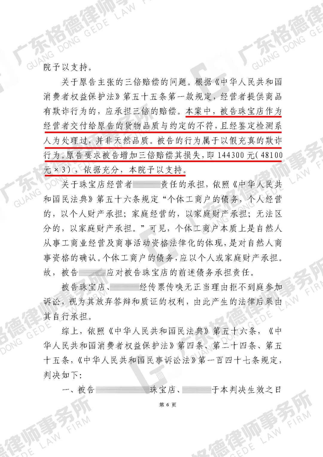 案件结果:判决对方退回货款、三倍赔偿共192400元。
