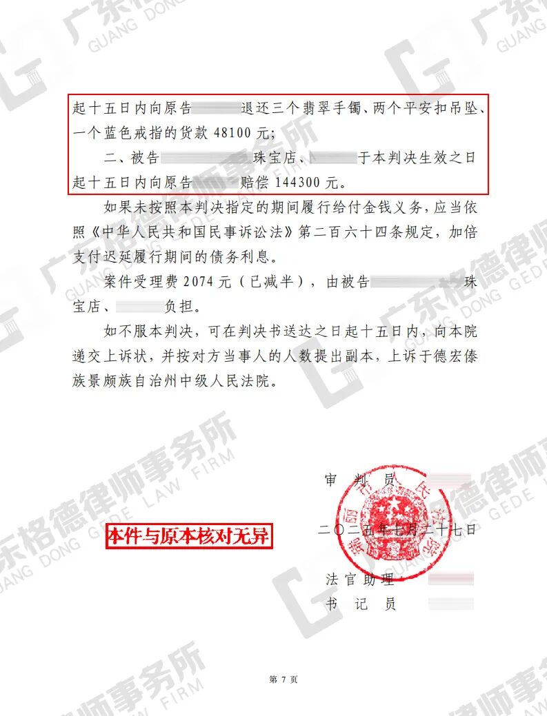 案件情况:当事人于微信直播间观看某珠宝店铺的卖货直播时,在工作人员承诺首饰为保真保天然的A货翡翠的情况下购买了翡翠。在收到商品后,当事人将翡翠送至专业机构鉴定,得知该翡翠品质为劣质非纯天然。经过与商家多次协商退款,当事人将翡翠退回,但却未收到退款。