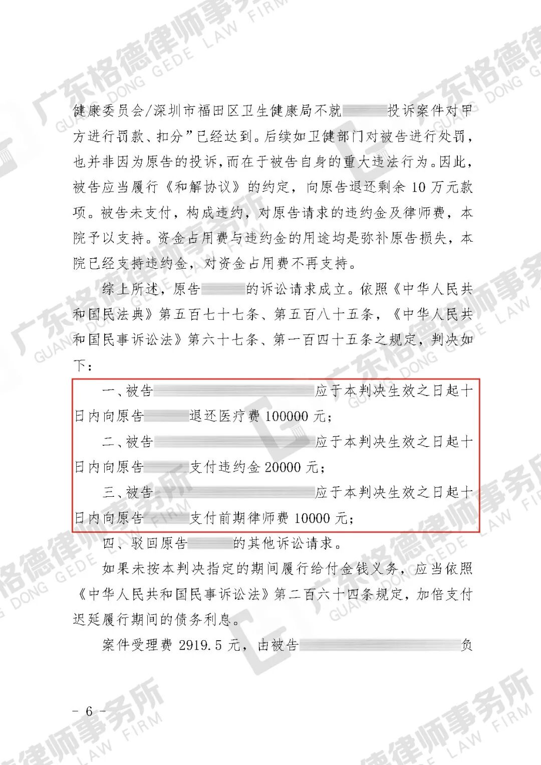 案件结果:判决该机构向原告退回医疗费100000元,并支付违约金及律师费共30000元。