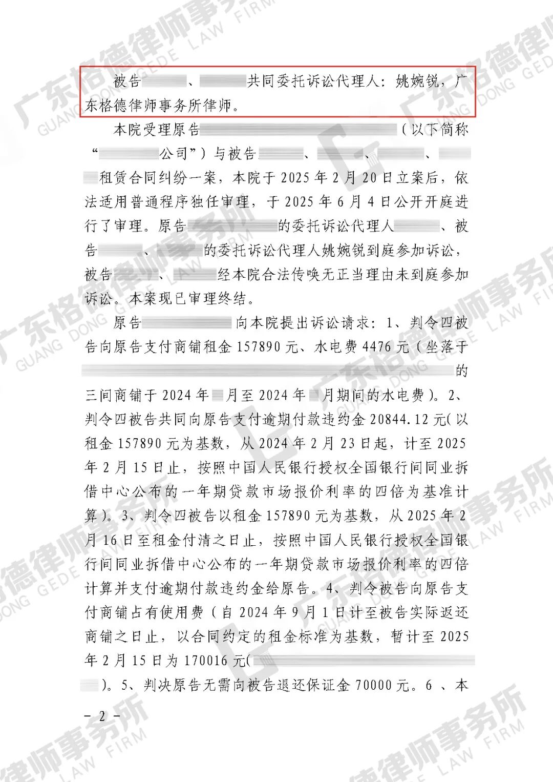 案件结果:驳回了对方要求支付逾期付款违约金、商铺占有使用费的诉求,为当事人减少赔偿金额19余万元。