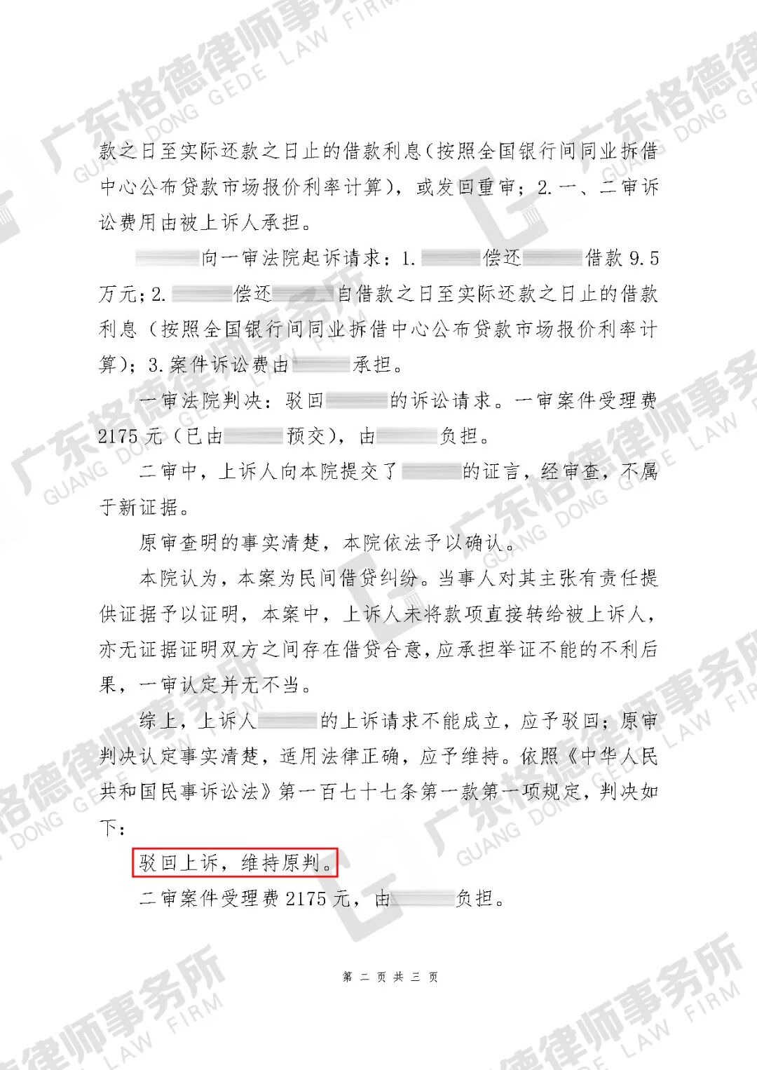 案件结果:二审维持原判,法院驳回了对方要求还款95000元的诉请。