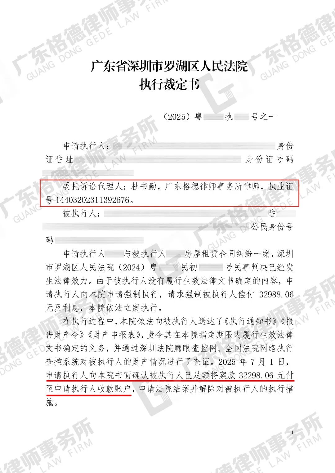 案件结果:律师团队成功申请执行,最终执行到账全部款项32298.06元。