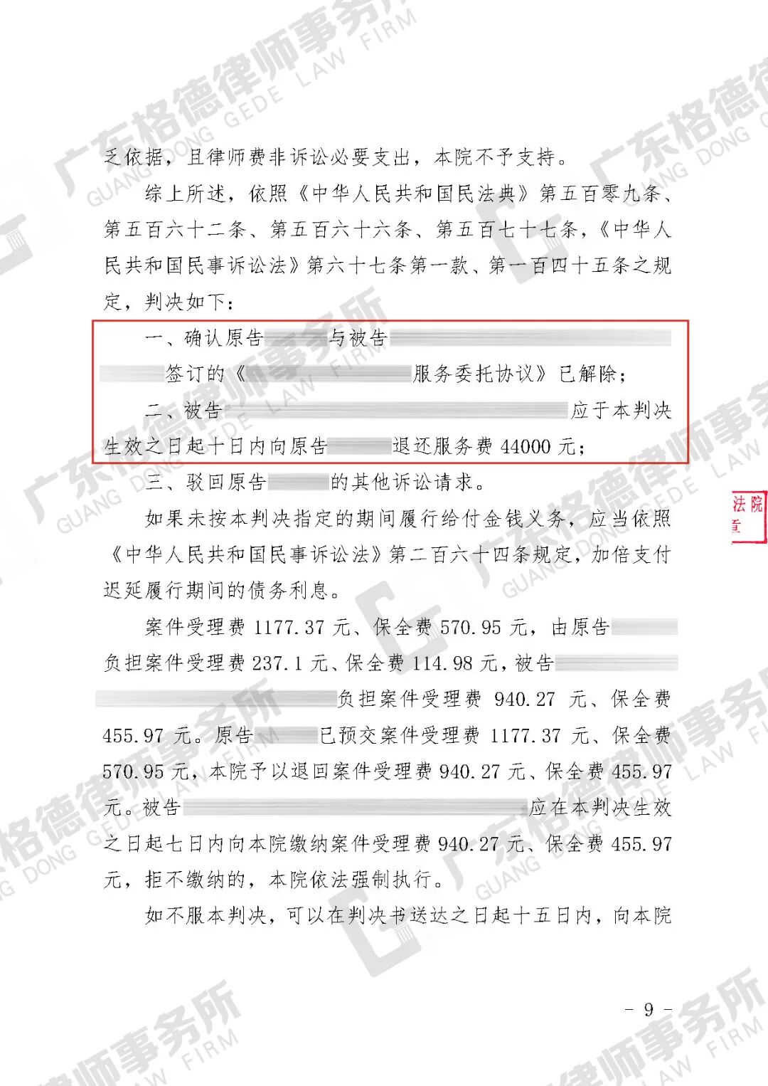 案件结果:判决公司向当事人退还服务费44000元。