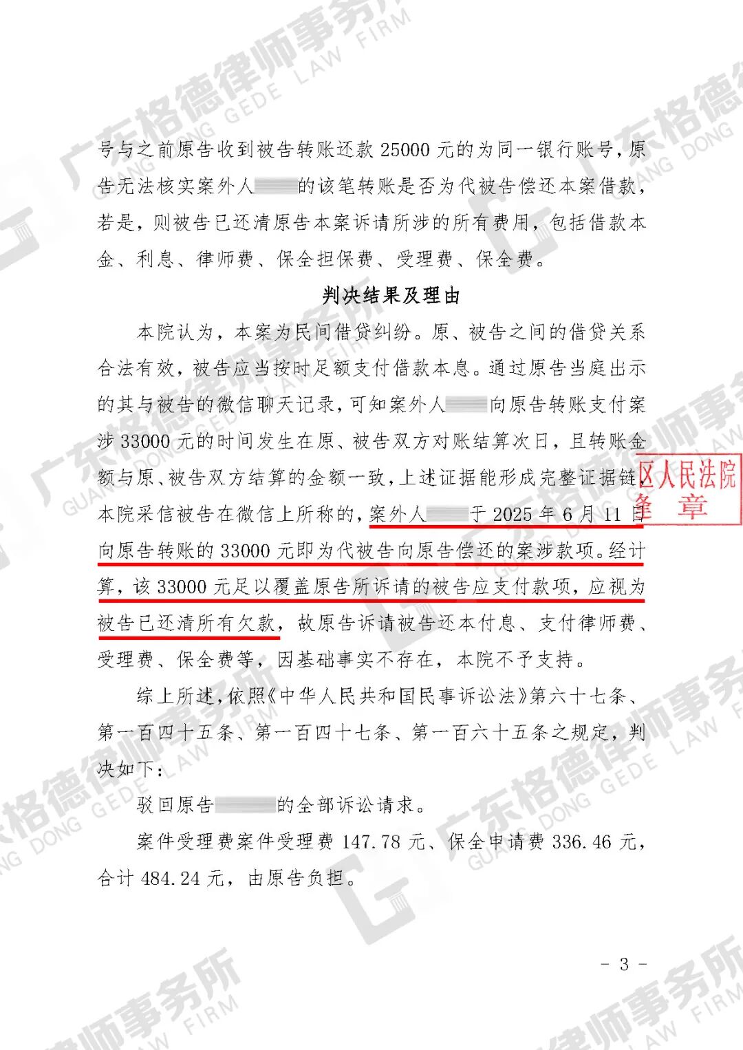 案件结果:对方通过第三人的账户支付剩余欠款33000元。