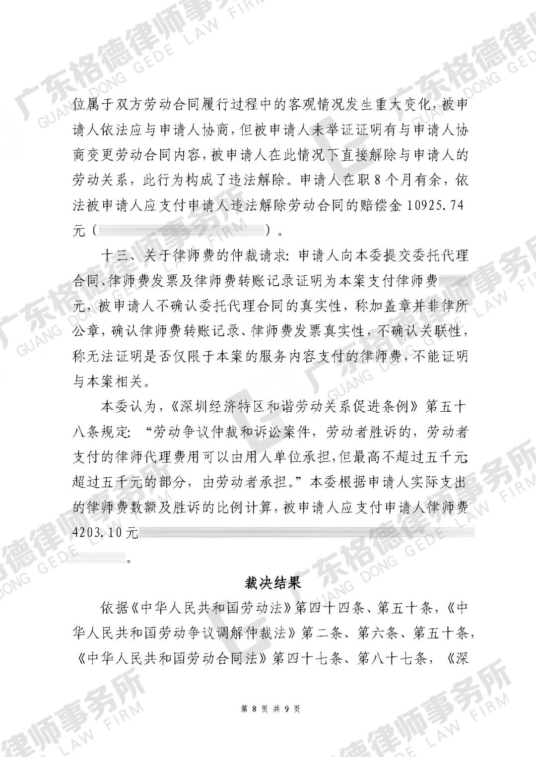 案件结果:仲裁该机构向当事人支付违法解除赔偿金、加班工资及律师费共18835.26元。