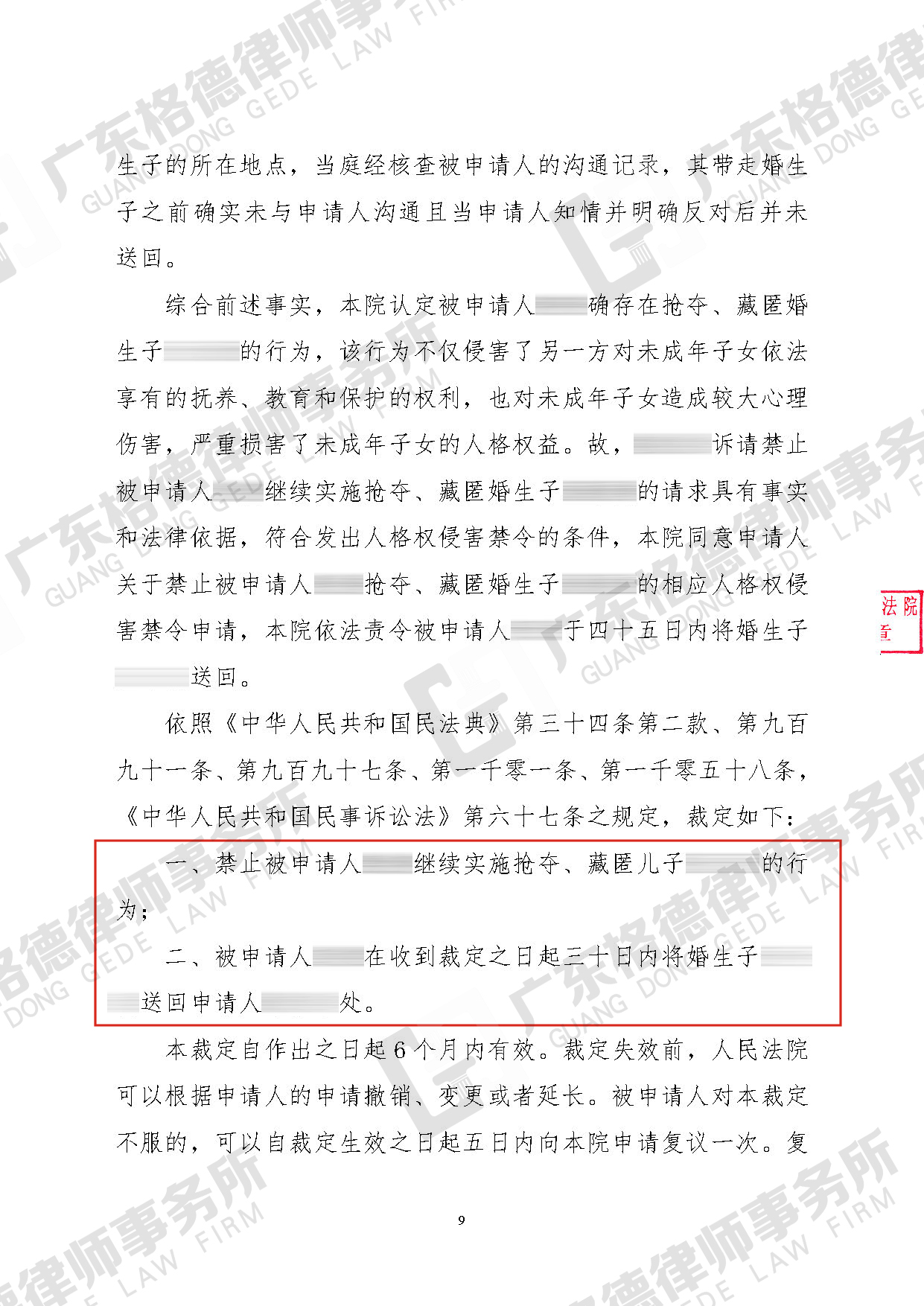 最终,法院经审理后支持了我方的主张,认定方廷存在抢夺、藏匿孩子的行为,并作出裁定:禁止方廷继续实施抢夺、藏匿孩子的行为,且于收到裁定之日起三十日内将孩子送回许丹处