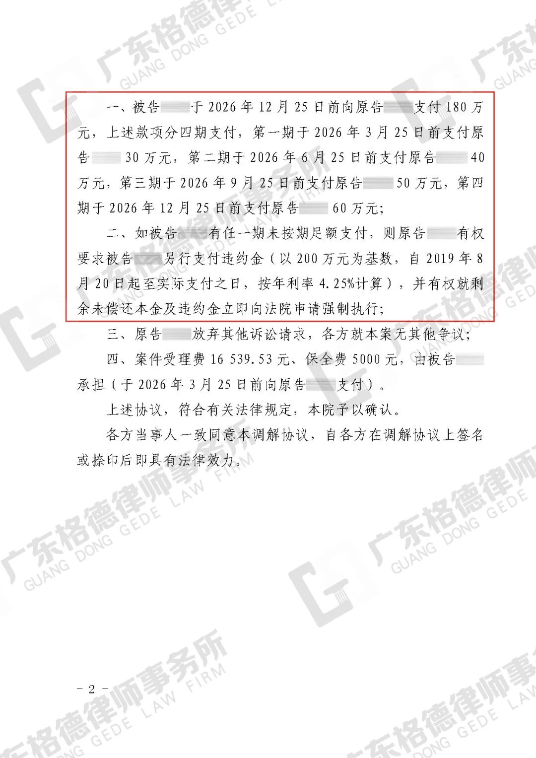 案件结果:双方达成调解,对方需支付180万元。