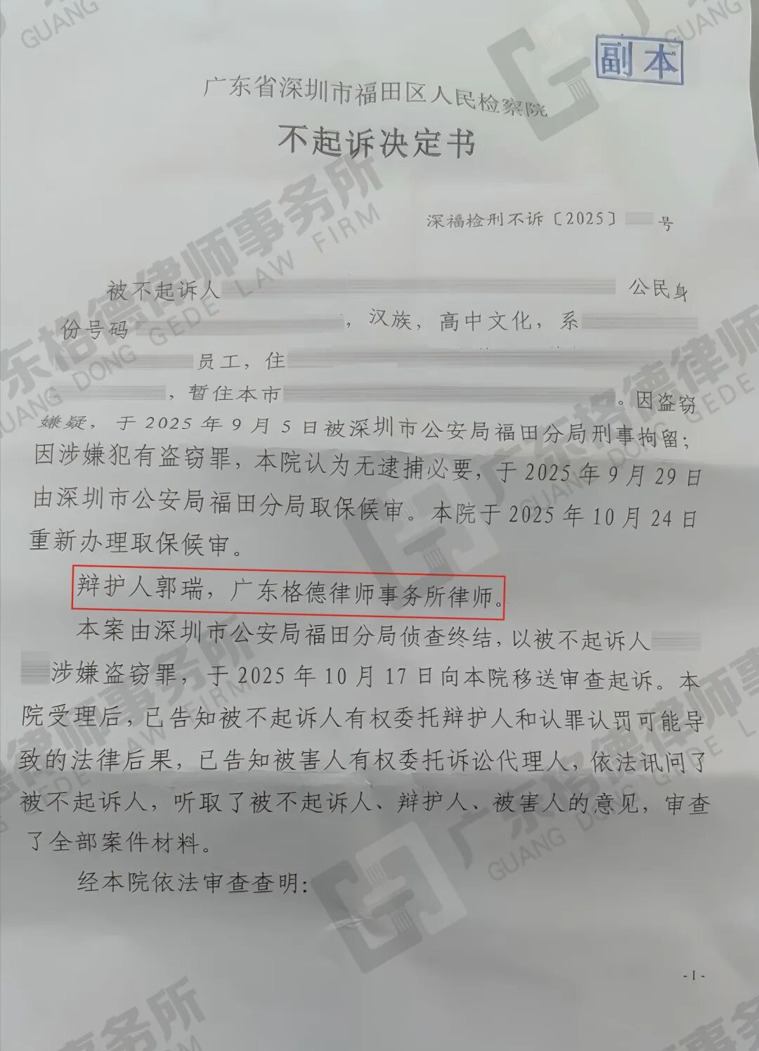 案件结果:律师团队协助当事人家属对超市进行赔偿并取得了对方谅解,后律师团队经二次取保后再次申请变更羁押成功,且不予批准逮捕;在律师团队的持续跟进下,当事人最终获不起诉决定。