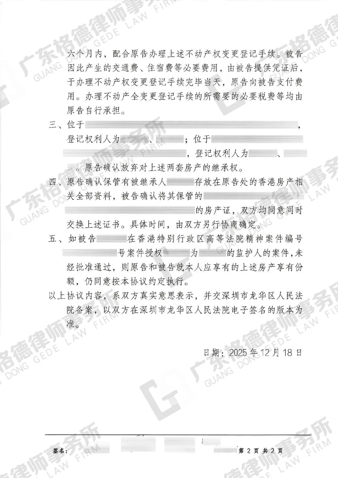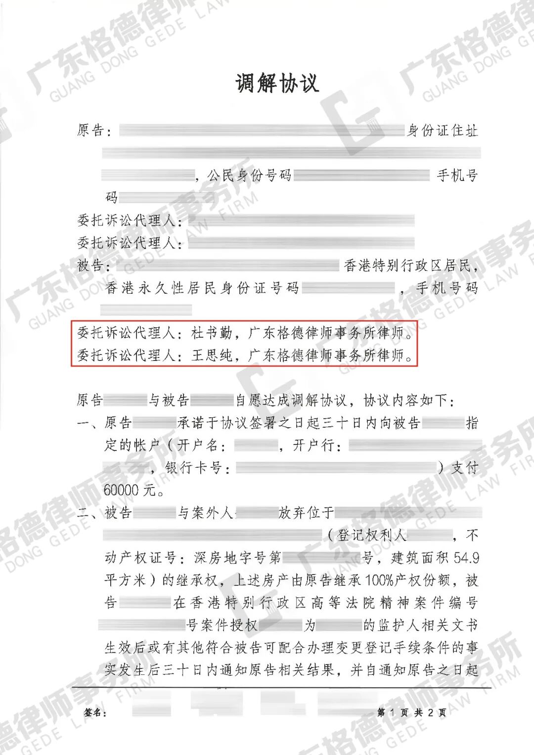 案件结果:双方达成调解,最终约定对方向当事人补偿60000元,当事人放弃继承位于深圳的一处房产,对方放弃继承位于香港的两处房产。