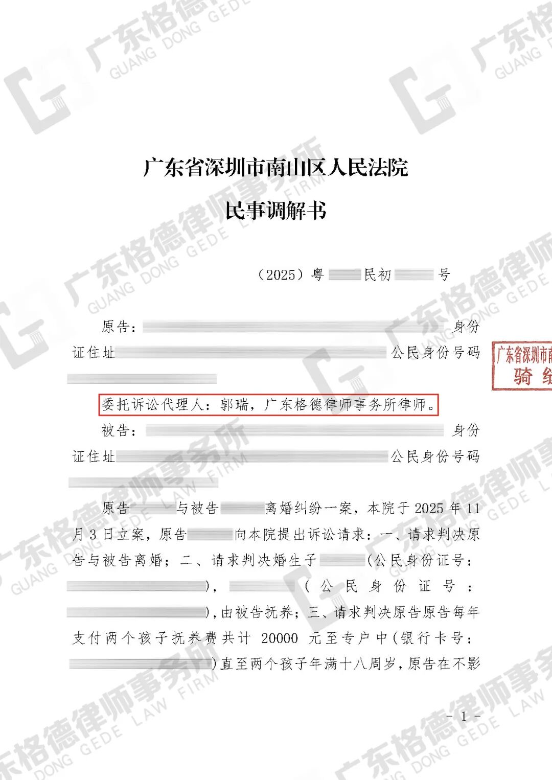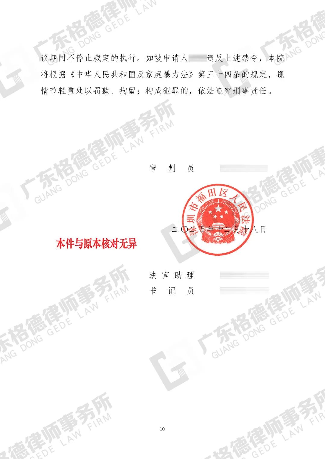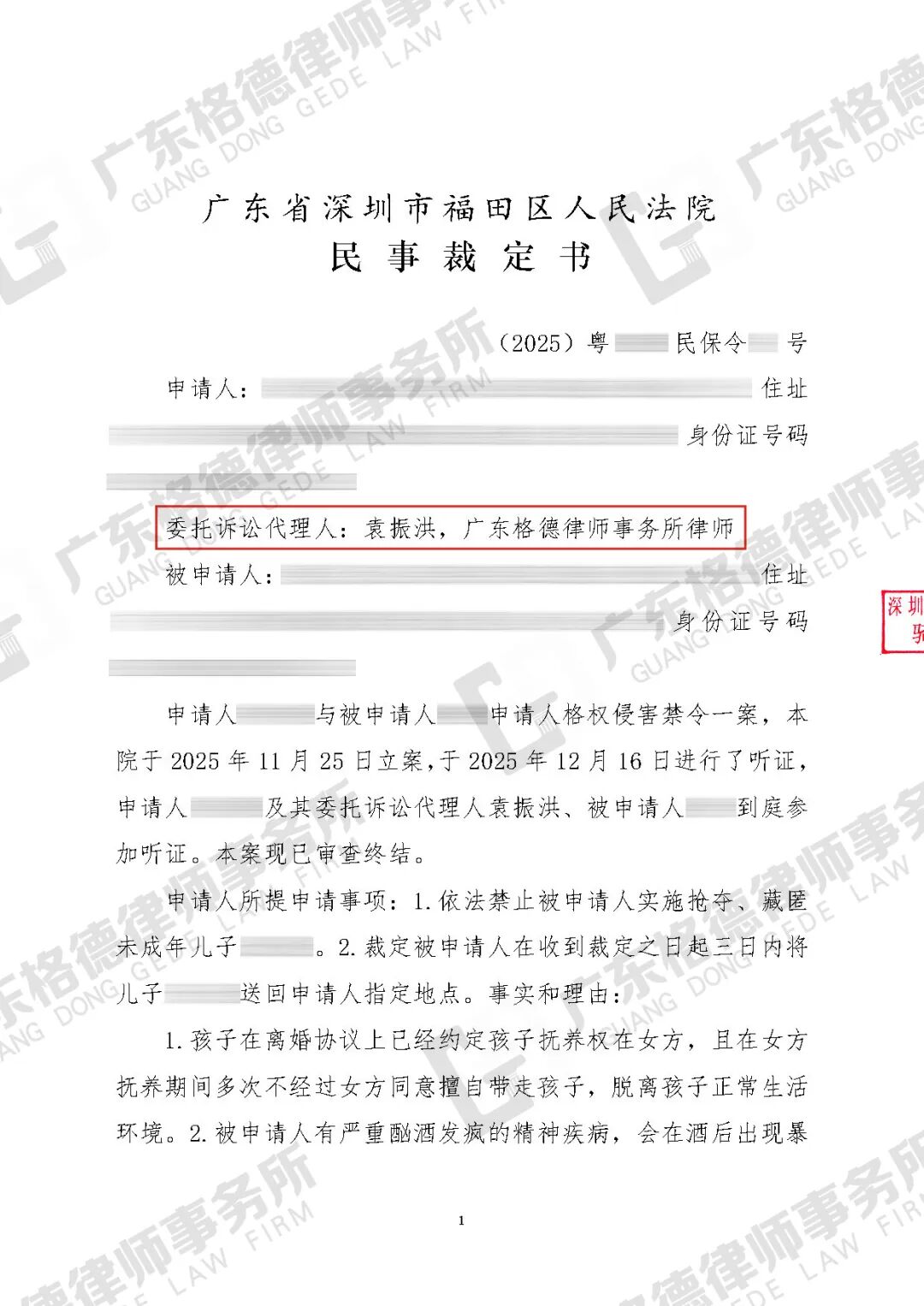 案件结果:律师团队代当事人向法院申请人格权侵害禁令,以完整的证据链成功证明对方正在实施抢夺、藏匿子女,并阻碍当事人依法行使监护权的事实。最终,法院作出裁定:禁止对方继续实施抢夺、藏匿孩子的行为,且于收到裁定之日起三十日内将孩子送回当事人处。