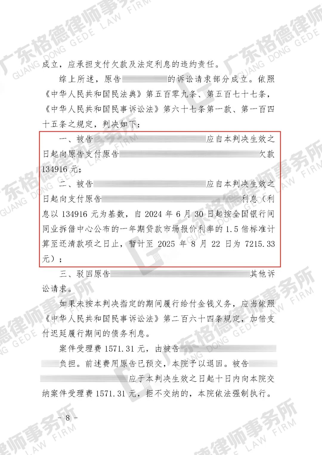 案件结果:判决对方公司支付欠款134916元并支付相应利息。