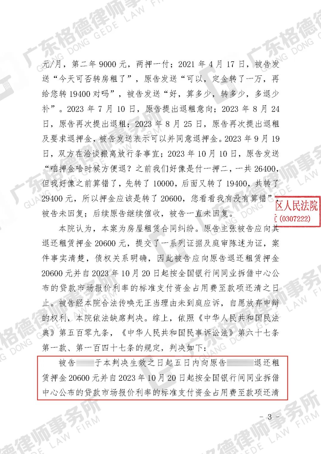 案件结果:判决对方退还押金20600元并支付相应的资金占用费。