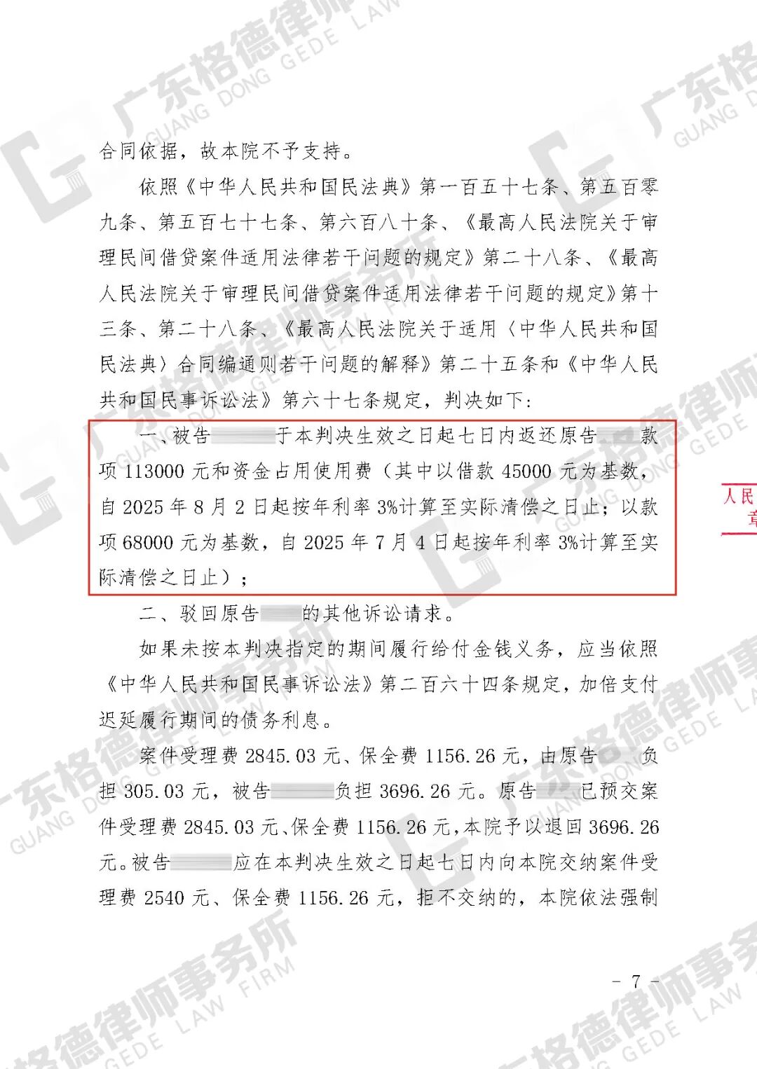 案件结果:判决对方偿还70000元及利息。