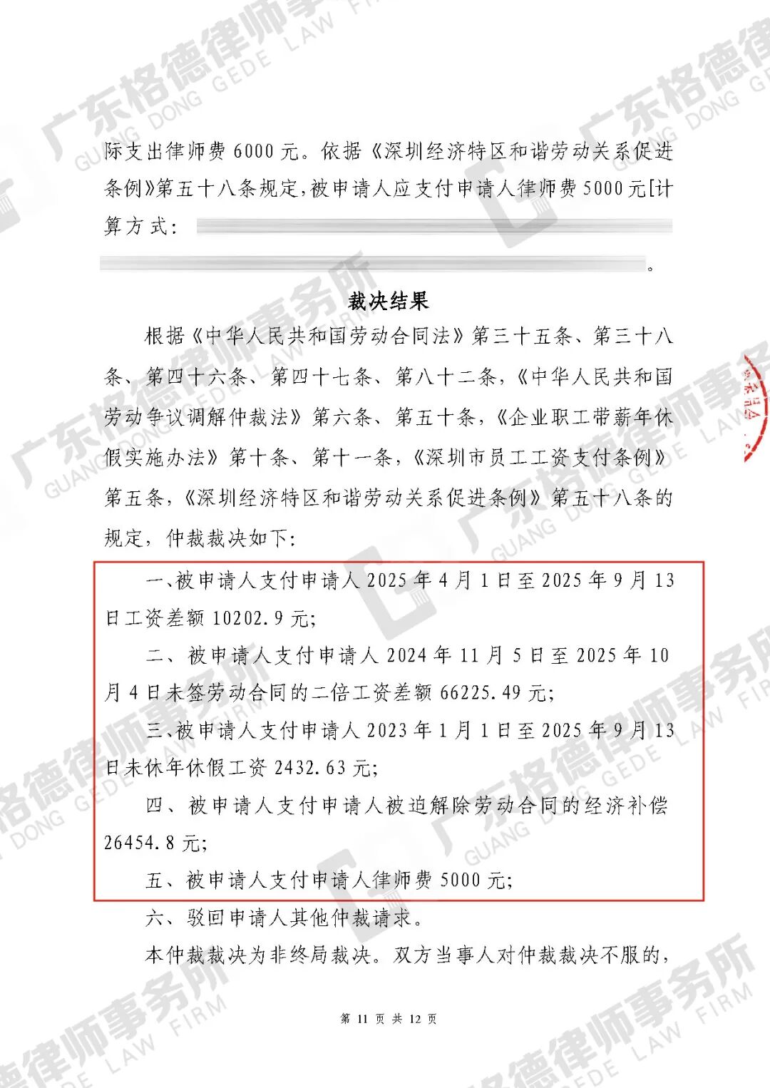 案件结果:裁决公司支付未签劳动合同二倍工资差额、违法解除赔偿金、年假工资、律师费等共110315.82元。