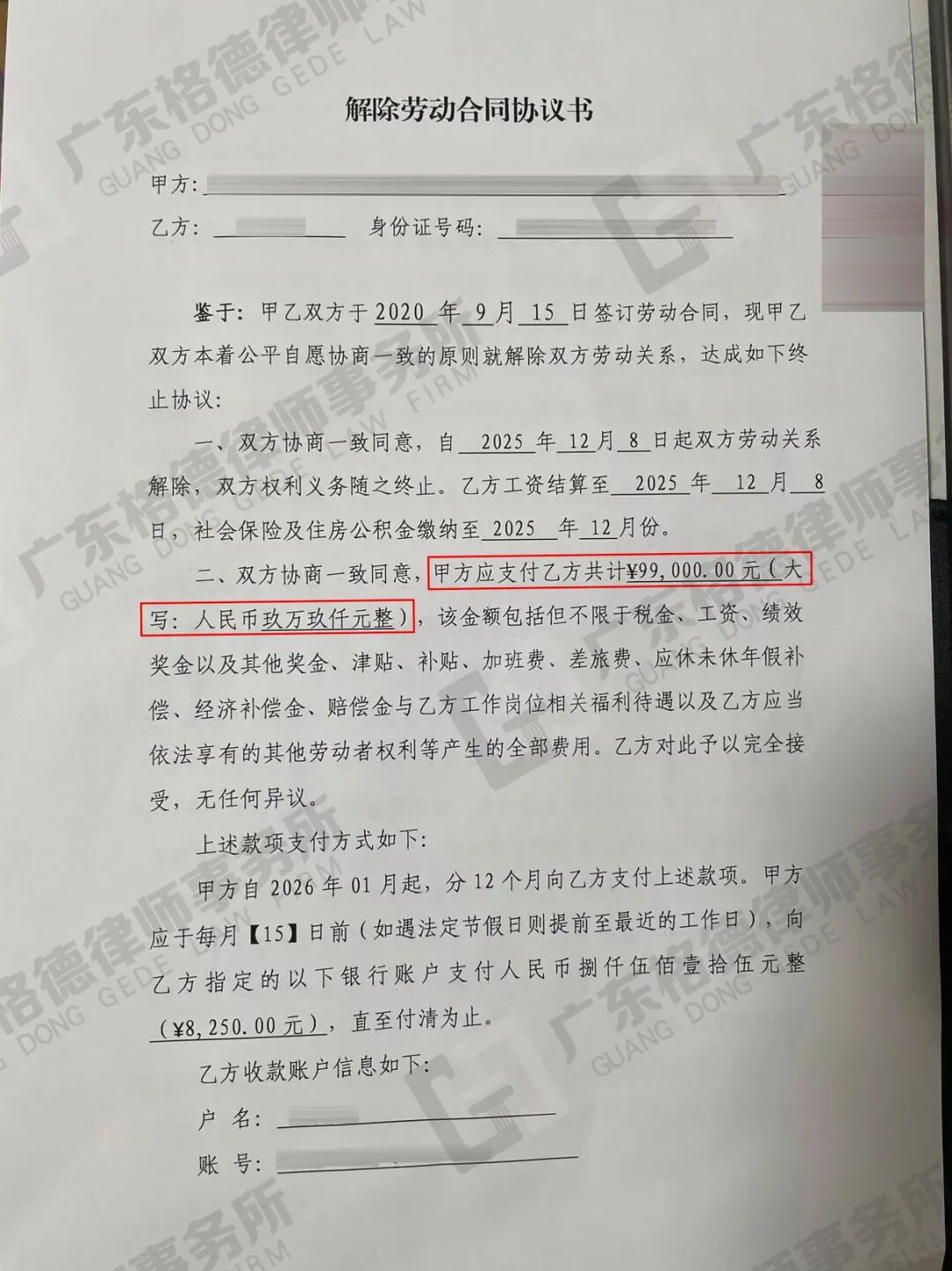 案件结果:在律师团队的协调沟通下,双方达成协商,对方向当事人支付九个月工资的款项,共计99000元。
