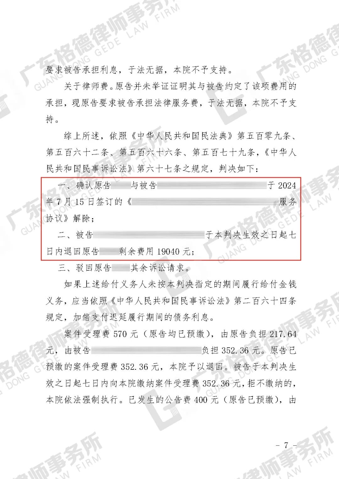 案件结果:判决该公司退还当事人费用19040元。