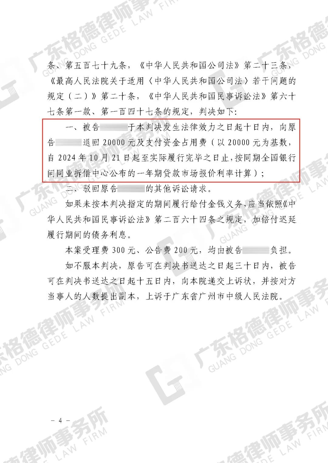 案件结果:判决该公司退还预付款20000元及资金占用费。