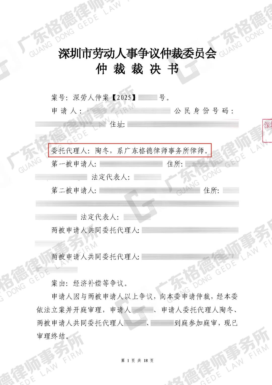 案件情况:当事人在工作时曾因公司未批准预支差旅费致无法顺利出差、不同意原先承诺的弹性上班申请被记为旷工等事件遭受记过、KPI打低分、降低职级等处罚。对此,当事人向公司提出了解除劳动合同通知,并委托了格德律所提起仲裁。