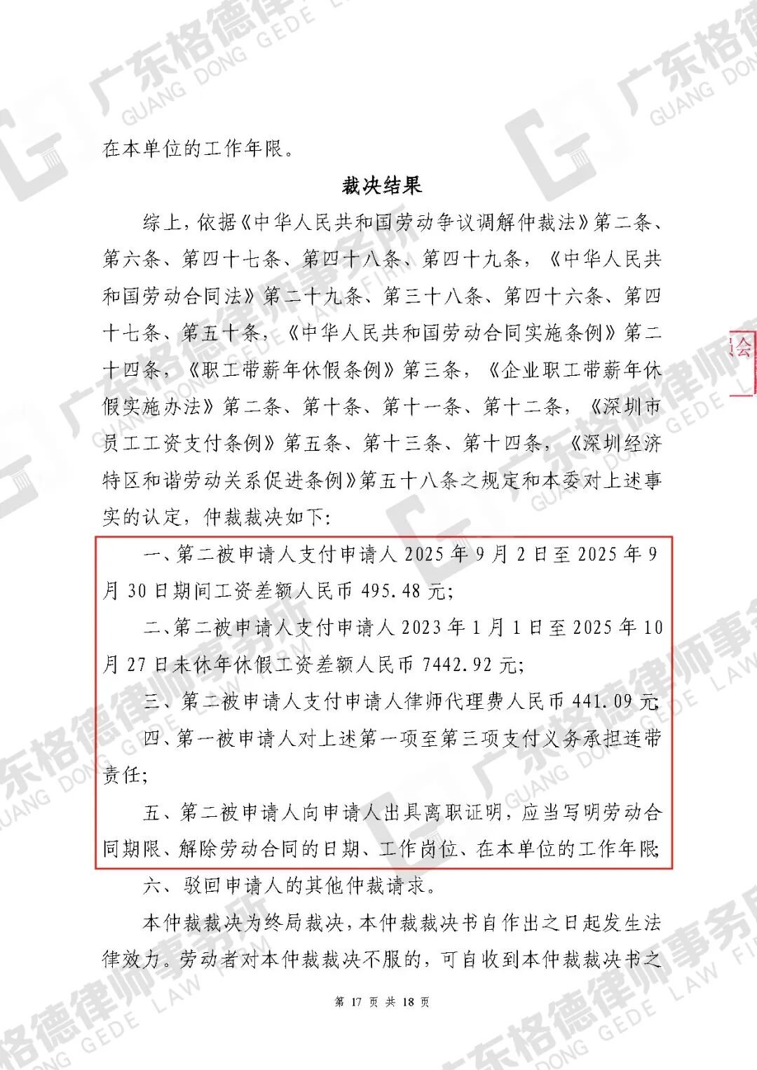 案件结果:裁决公司支付工资差额、未休年假工资、律师费共8379.49元。