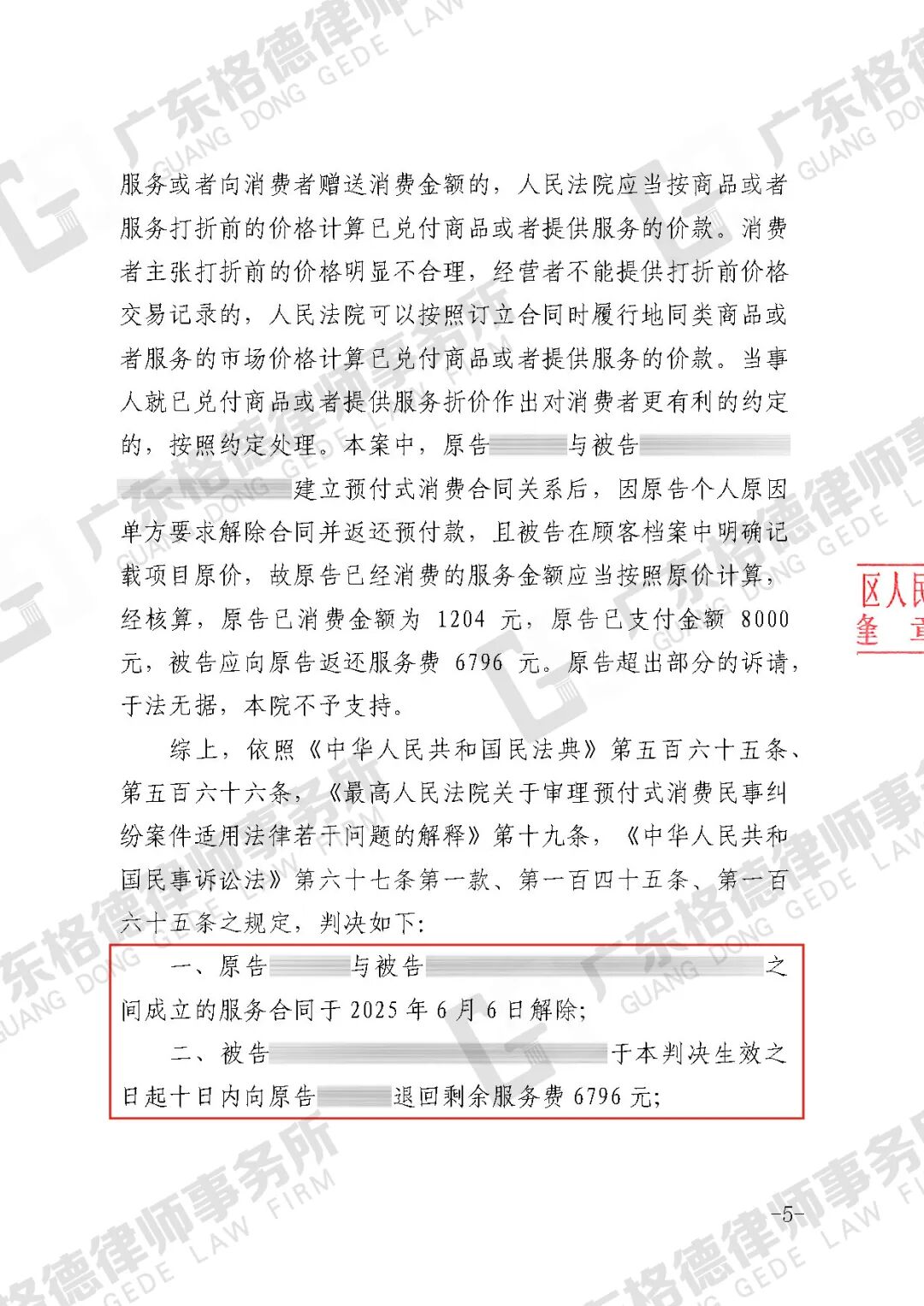 案件结果:判决美容院向当事人退还剩余费用6796元。