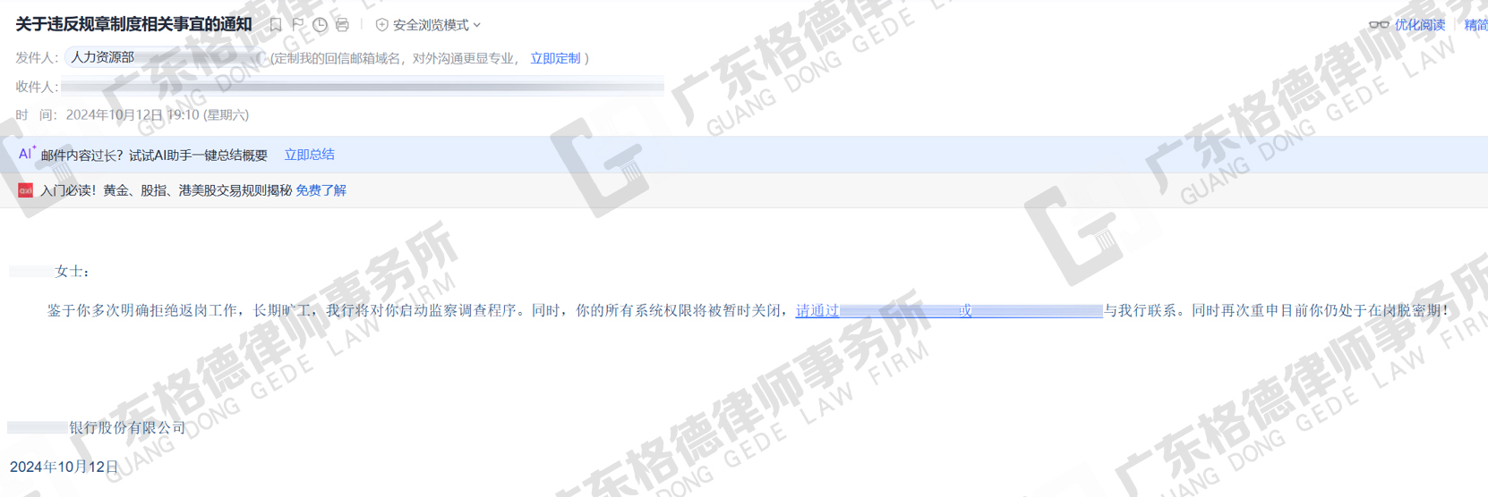 眼见公司要么装聋作哑,要么机械般回应,徐悦索性也放弃沟通。直到当月发薪日,徐悦发现工资未正常到账,后续查看工资条才得知,该月工资不仅未发放,甚至被抵扣为负数。付费上班的荒诞遭遇让徐悦感到又好气又好笑,她就此向公司质询,公司则以徐悦多次拒绝返岗、长期旷工为由,直接关闭了其工作沟通软件、办公系统等全部权限,仅保留人力资源部的邮箱及联系电话作为唯一沟通渠道。在沟通彻底中断后,徐悦来到了格德律师事务所,决定通过法律途径维护自身权益。