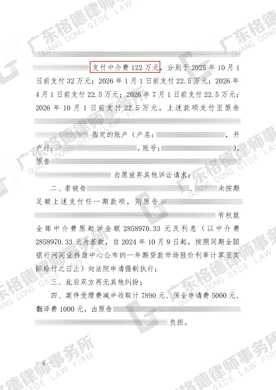 案件结果:双方成功达成调解,对方向当事人分期支付共122万元人民币的佣金,目前已履行第1期。