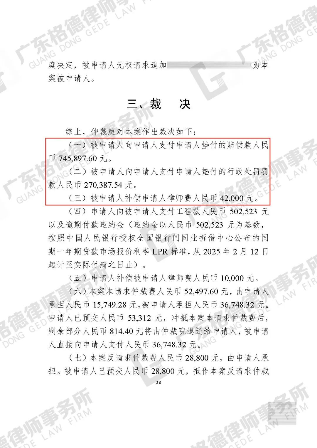 案件结果:仲裁庭经审理,裁决承包公司承担70%的责任,需向委托方支付赔偿款、处罚款、律师费共1058285.14元。