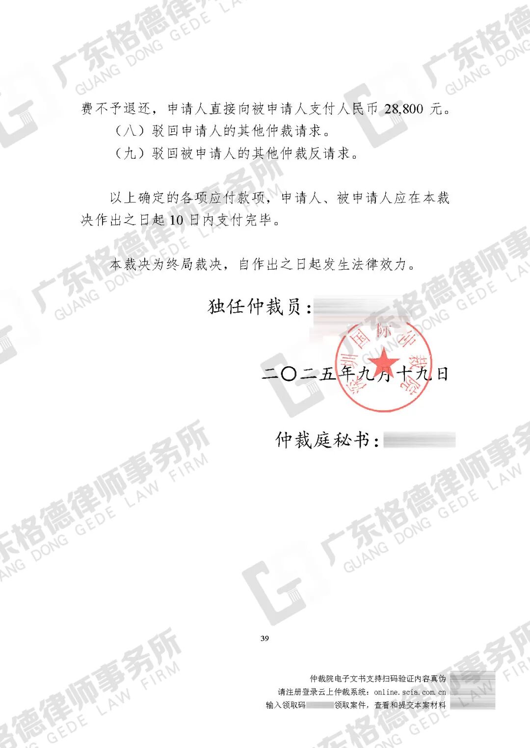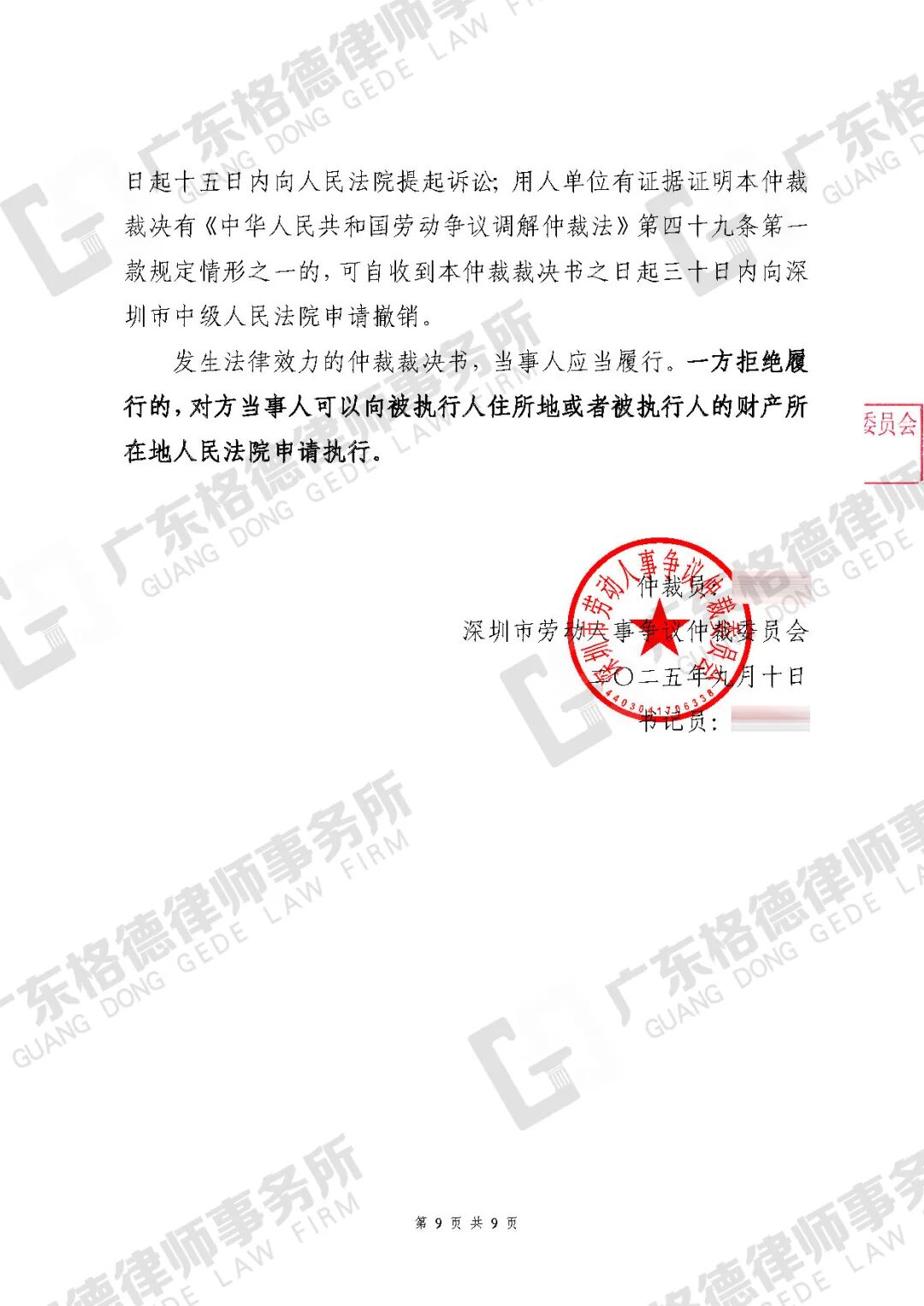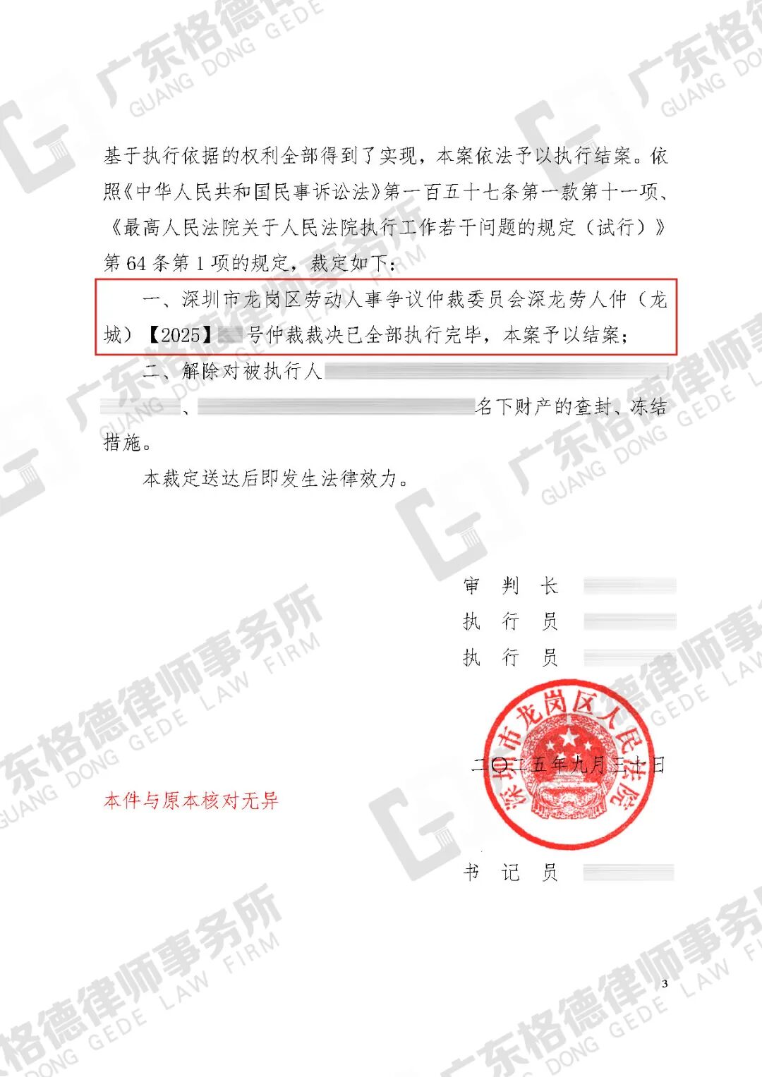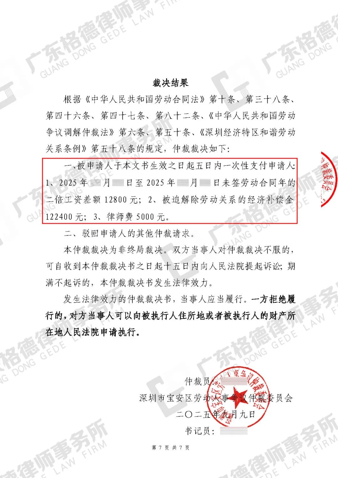 案件情况:当事人工作的烧烤店因经营不善决定歇业,在歇业停工期间,经理通过微信告知当事人其劳动合同已解除。当事人遂向经理要求支付相应的补偿金及未发放工资,却未得到对方回应。在委托我所提起仲裁后,仲裁委裁决该餐饮公司支付当事人停工期间正常薪资、加班费、违法解除劳动合同赔偿金、律师费,总计33228.5元,我方主张的支持比例高达94%。后因对方未履行支付义务,我方向法院申请强制执行。