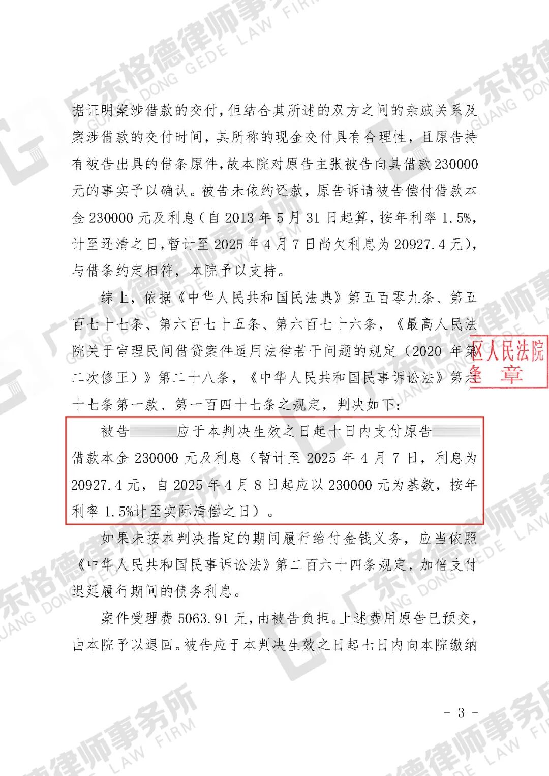 案件结果:判决对方向当事人支付本金230000元及利息。