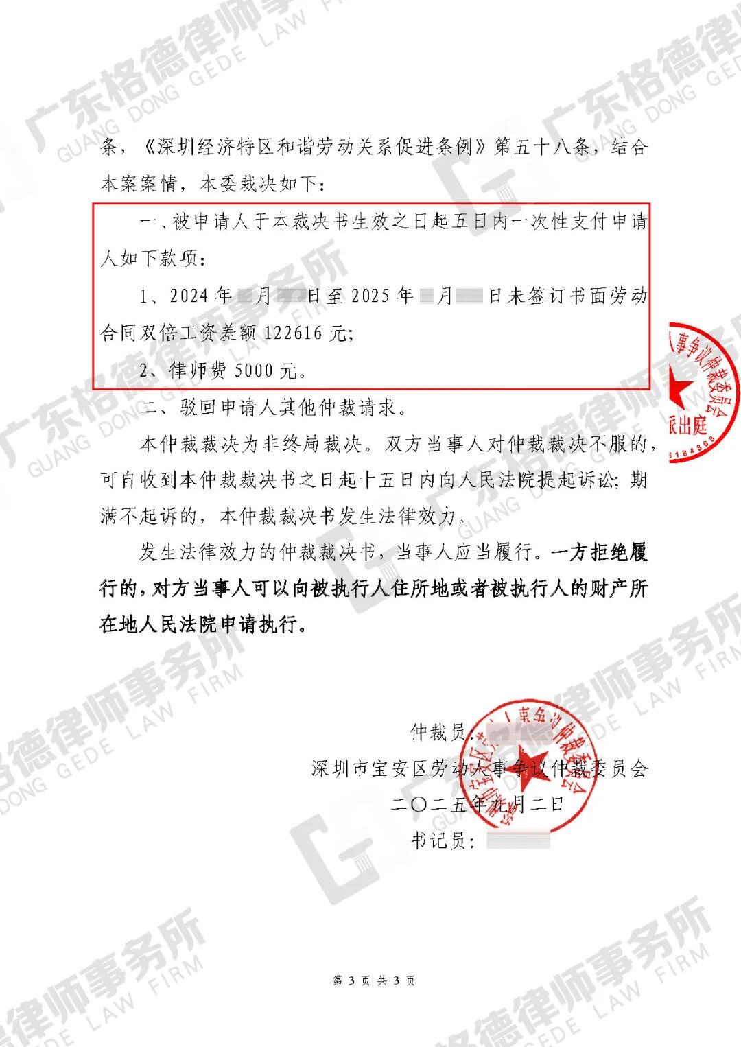 案件结果:仲裁获得未签劳动合同二倍工资差额、律师费共127616元。