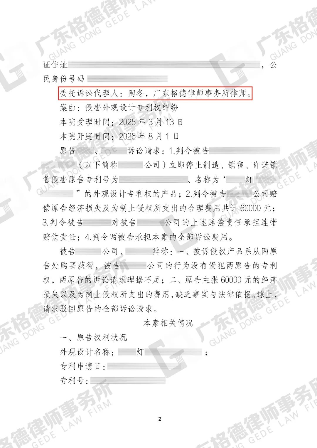 案件情况:委托方所销售的灯泡设计与某款专利设计灯泡在外观上雷同,被专利方以侵害外观设计专利权纠纷起诉,要求赔偿100000元。