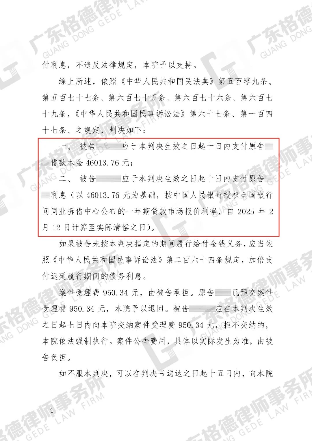 案件结果:判决对方偿还剩余借款本金46013.76元及支付利息。