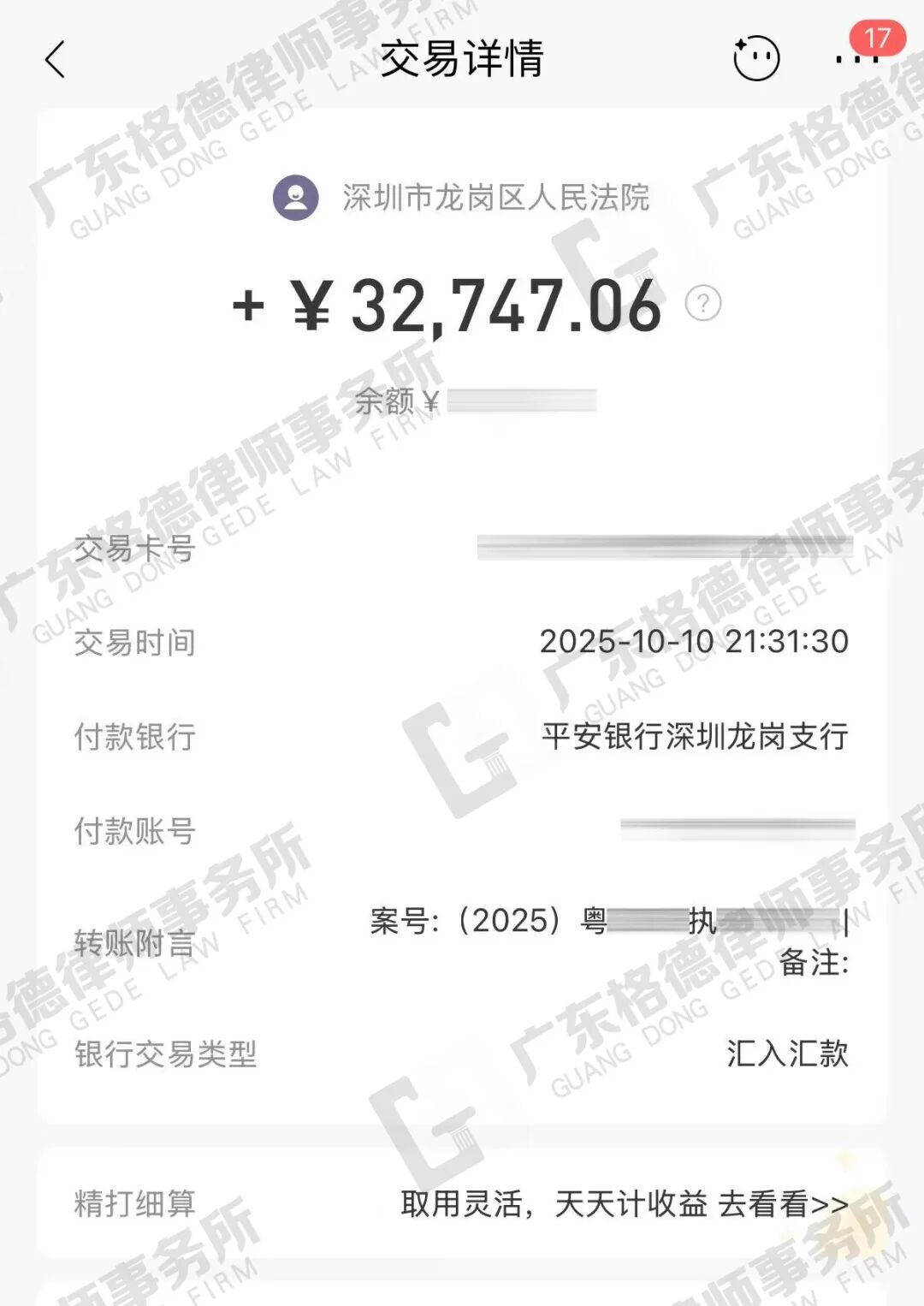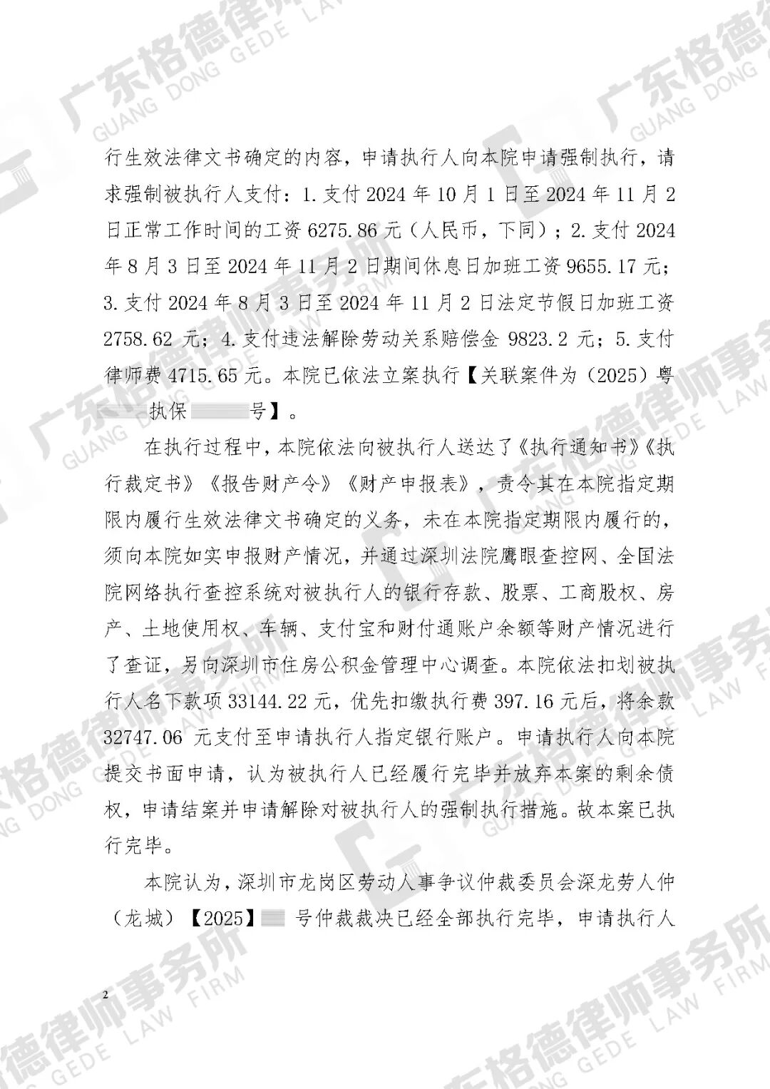 案件结果:律师团队成功申请执行,最终执行到账32747.06元(已扣除执行费)。