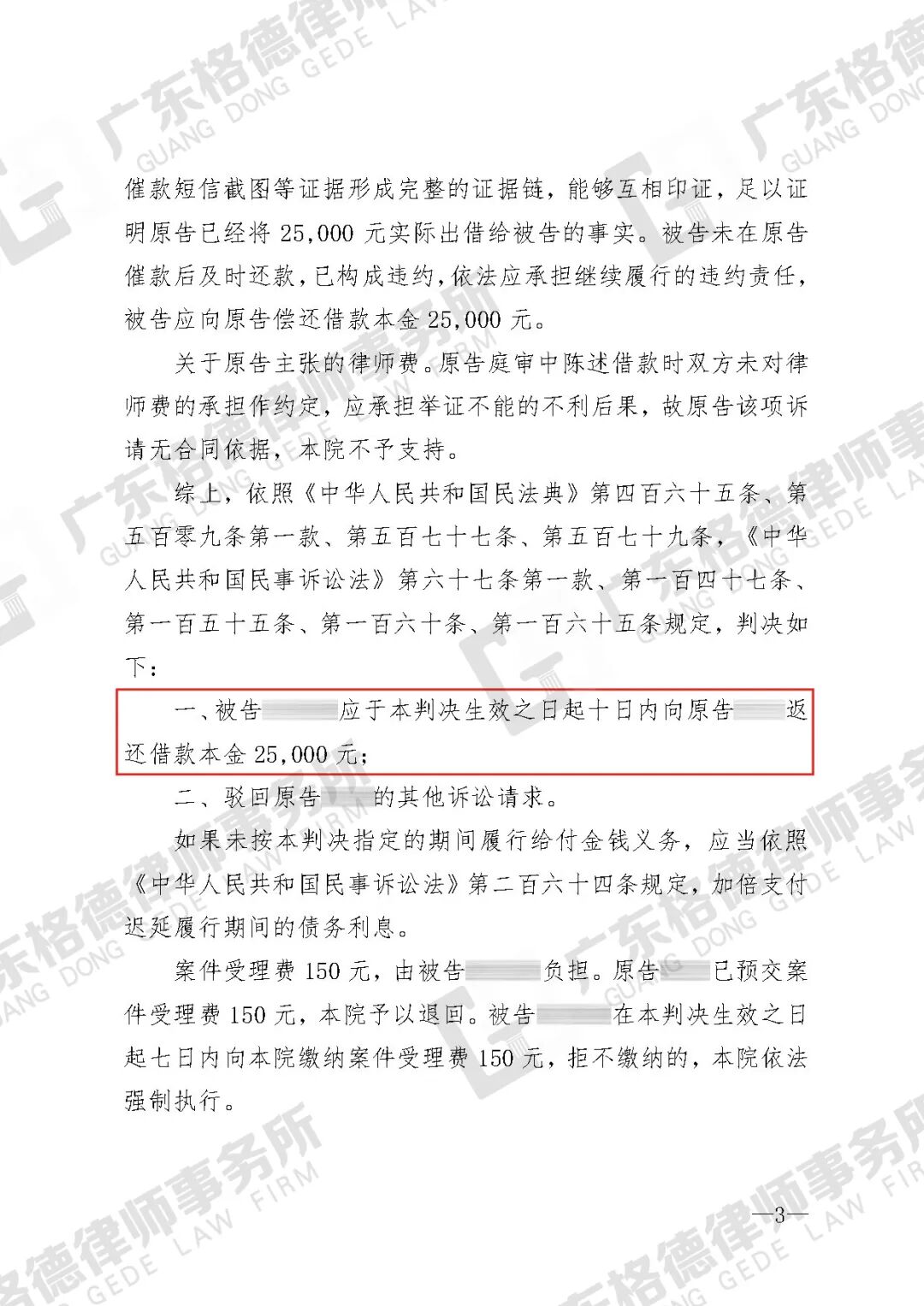 案件结果:判决对方返还借款本金25000元。
