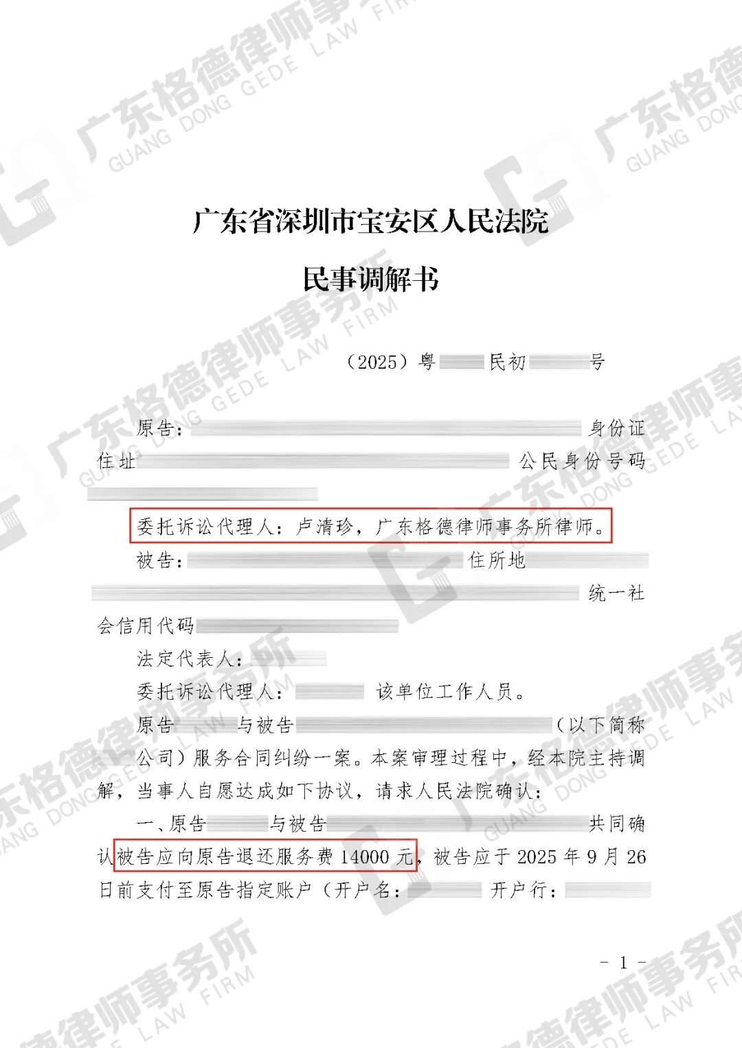 案件结果:双方达成调解,对方向当事人退还服务费14000元。