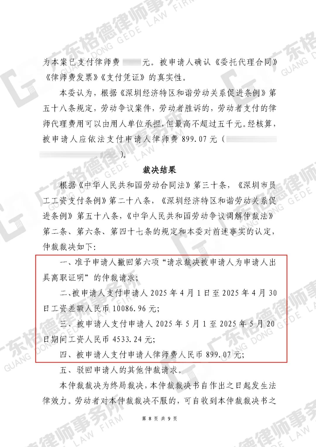 案件结果:仲裁获得工资、律师费共15519.27元。
