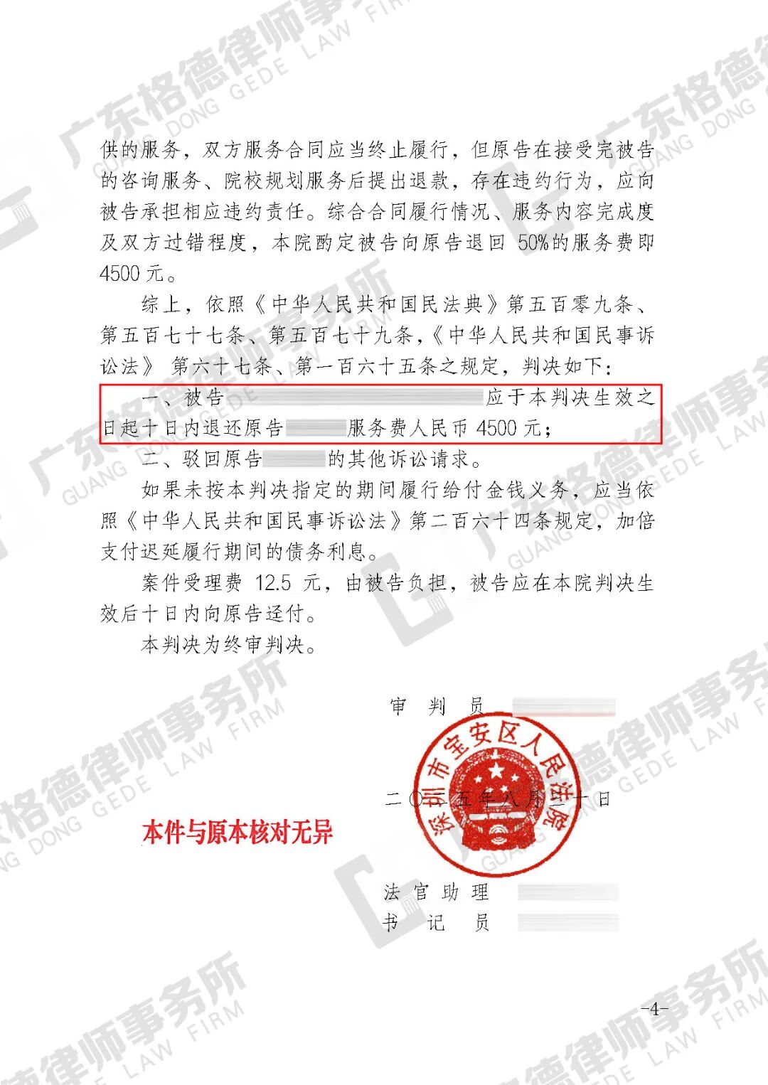 案件结果:判决机构退还当事人服务费4500元。